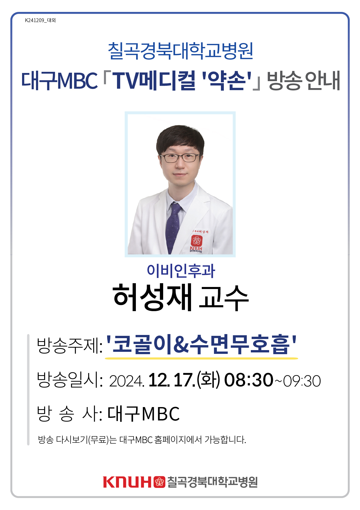 방송주제: 코골이&수면무호흡 방송일시: 2024. 12. 17. (화) 8:30~9:30 방 송 사: 대구MBC |