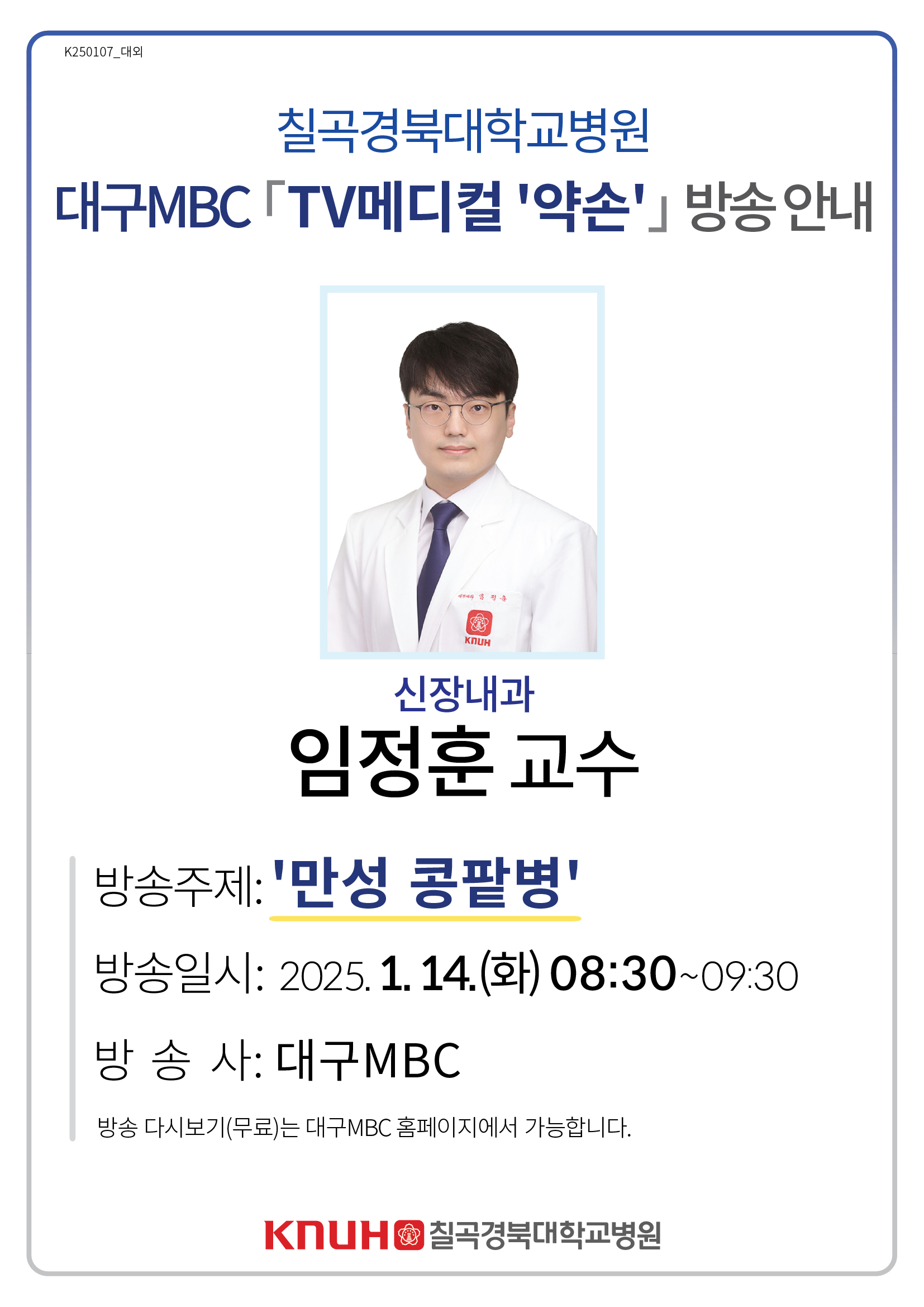 방송주제: 만성 콩팥병 방송일시: 2025. 1. 14. (화) 8:30~9:30 방 송 사: 대구MBC |
