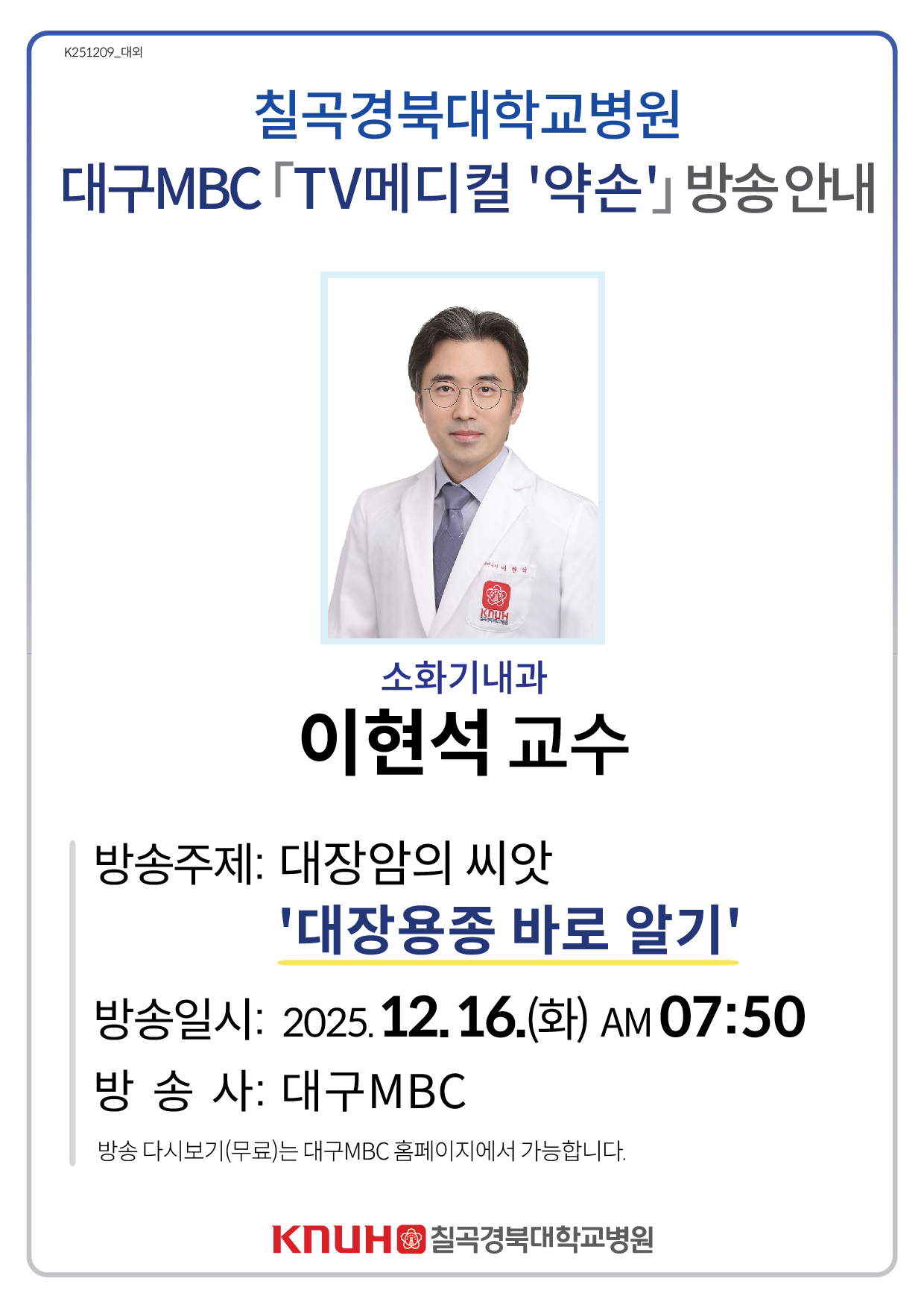 ○ 방송주제 : 대장용종바로알기○ 방송일시 : 2025. 12. 16.(화) 07:50○ 방 송 사 : 대구MBC* 많은 관심과 시청바랍니다.* 다시보기는(무료)대구 MBC 홈페이지에서 가능합니다