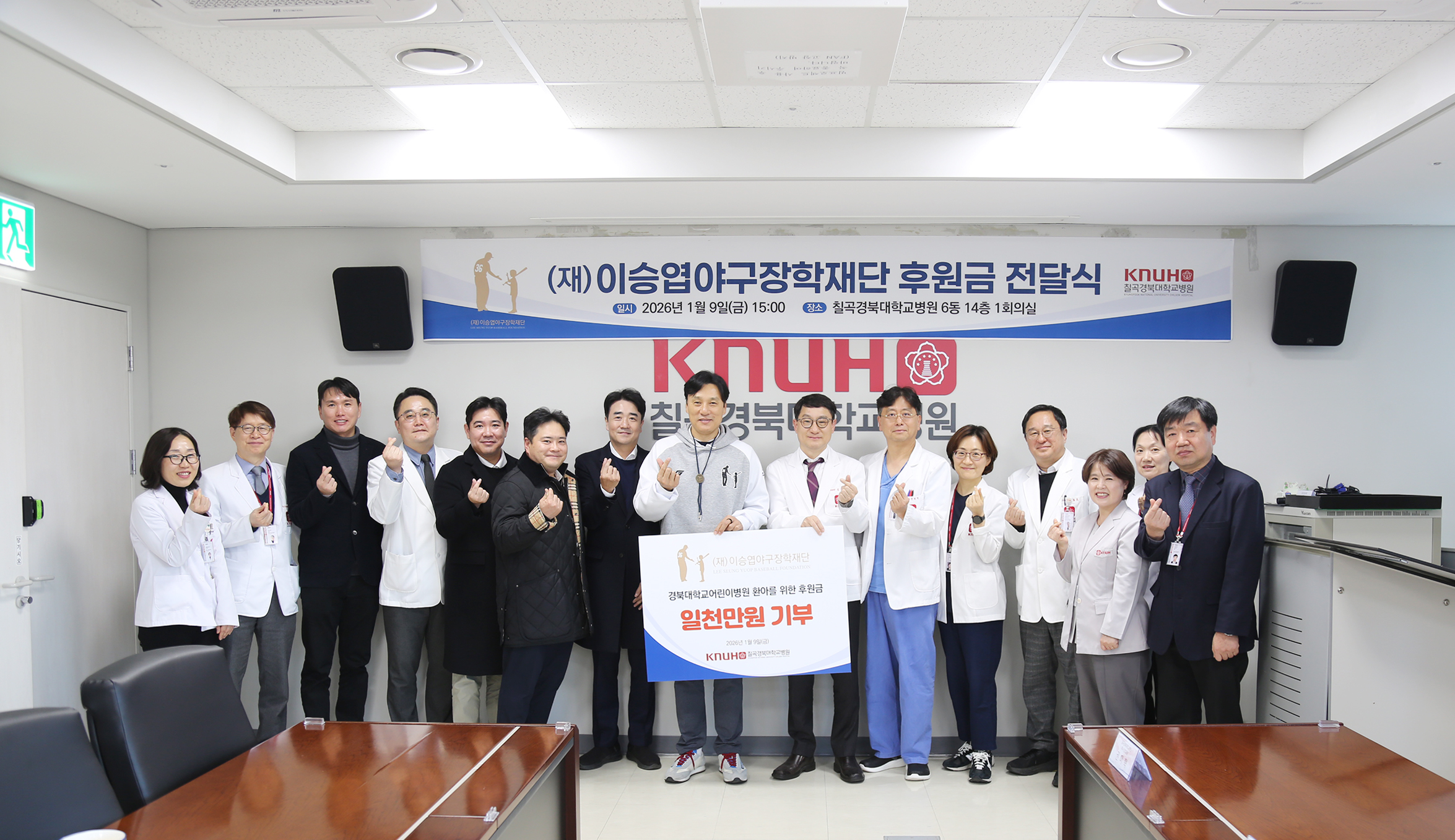 ○ (재)이승엽야구장학재단(이사장 이승엽)은 지난 1월 9일 경북대학교어린이병원 환아를 위한 성금 1천만 원을 기탁했다. ○ 이승엽야구장학재단은 2018년부터 경북대학교 어린이병원에 성금을 전달해 왔으며, 올해까지 총 8차례에 걸쳐 후원을 이어오고 있다. ○ 이번 성금은 어린이병원 저소득층 및 중증 환아의 의료비 지원과 필수 의료·돌봄 체계 운영 등에 사용될 예정이다. ○ 이승엽 이사장은 전달식에서 “투병 중인 아이들과 가족들에게 작은 힘이 되기를 바란다”며 “앞으로도 야구장학재단을 통해 꾸준한 후원을 이어가겠다”고 말했다. ○ 김종광 칠곡경북대학교병원장은 “지속적인 관심과 후원에 깊이 감사드린다”며 “후원된 성금은 치료와 돌봄이 절실한 환아들을 위해 의미 있게 사용하겠다”고 밝혔다.