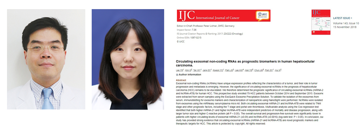 칠곡경북대학교병원 간암센터 박수영 교수(교신저자), 이유림 교수(제1저자)가 국제암저널(International Journal of Cancer)에 "Circulating exosomal noncoding RNAs as prognostic biomarkers in human hepatocellular carcinoma" 논문을 발표한 논문이칠곡경북대학교병원 10월 '이달의 논문' 에 선정되었다. 국제암저널(International Journal of Cancer)은 국제암기구(IARC) 공식학술지로 국제 저명한 학술지로 인정받아오고 있다. 한편, 이 논문은 국제논문인용지수 Impact Factor 7.36로 종양학 분야 상위 10%에 포함되 눈길을 끌었다. |