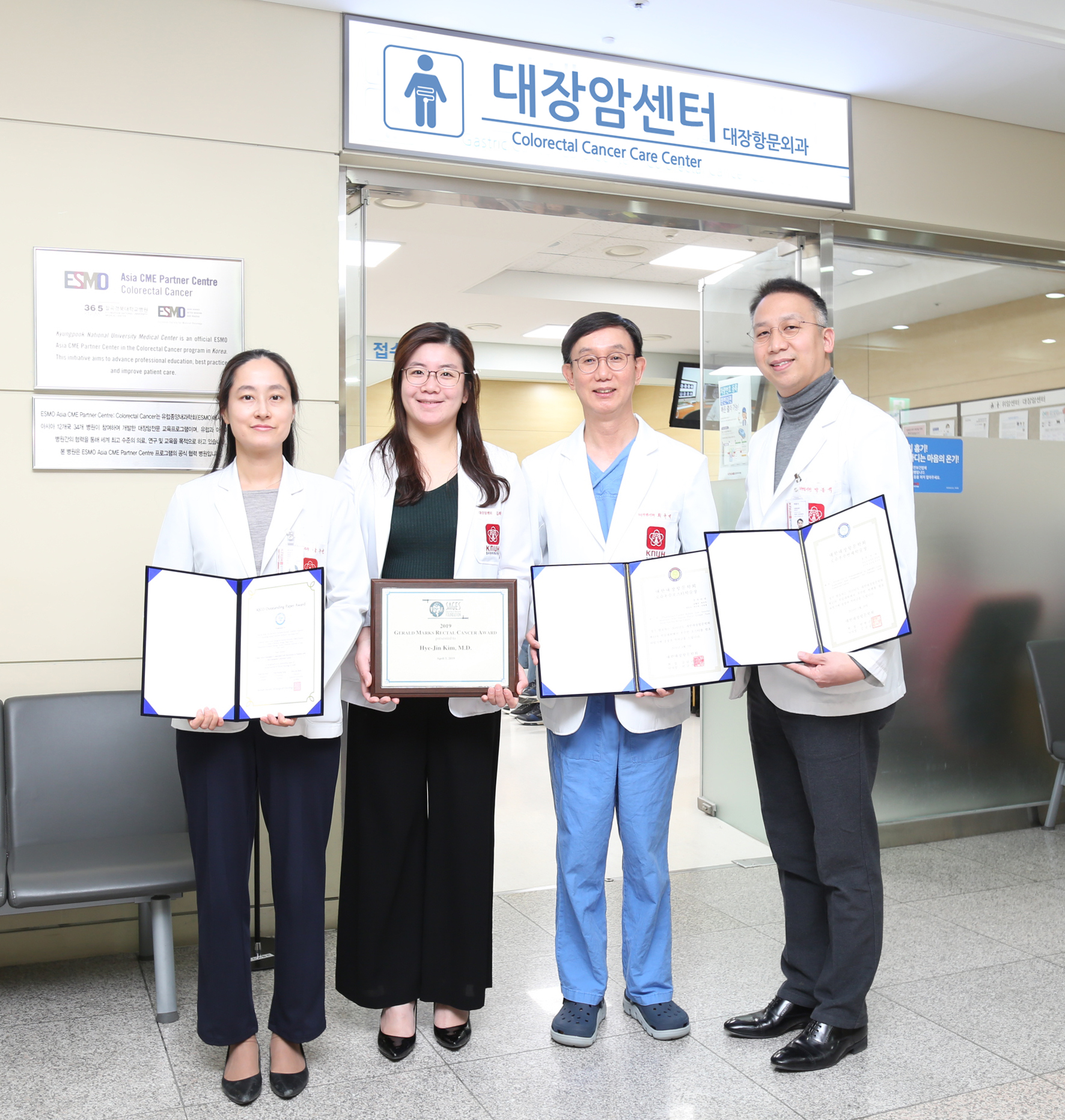 칠곡경북대병원 대장암센터(최규석, 박준석, 박수연, 김혜진 교수)가 그동안 대장암 치료의 발전에 지속적인 노력을 기울여온 우수한 치료 성과와 연구 역량을 인정받아 금년 상반기 다수의 국내외 저명한 학회에서 수상하는 업적을 달성했다. ▶2019 미국 내시경복강경외과학회 제랄드 막스 직장암 상 수상 ▶2019 대한대장항문학회 최우수 연제상 및 최우수 논문상 수상 ▶2019 대한임상종양외과학회 최우수 논문 수상