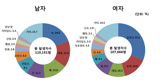 < 성별 주요 암종 발생분율, 2011 : 중앙암등록본부 >