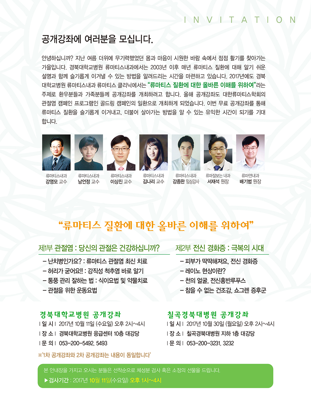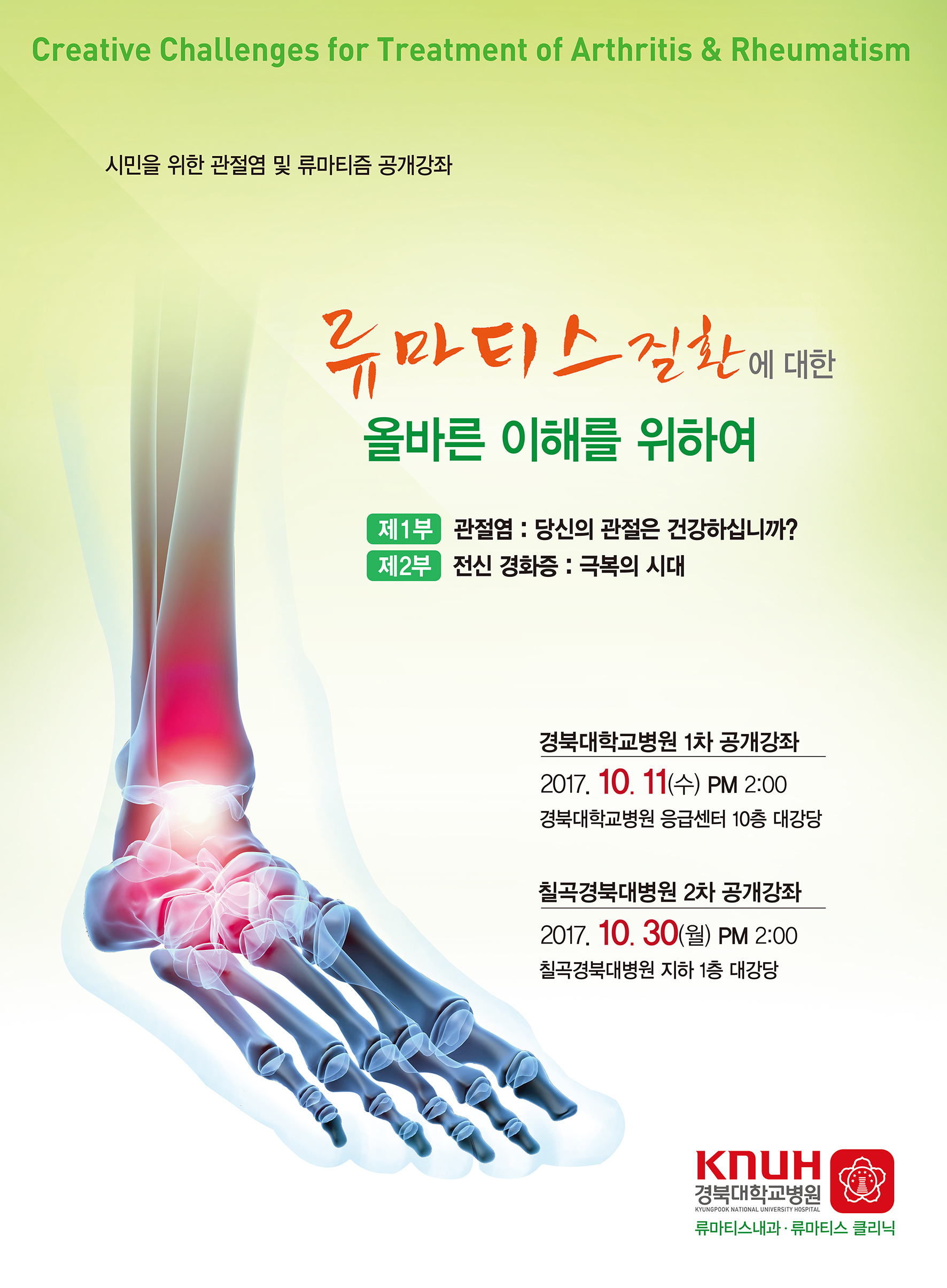 10월 11일(경북대병원 10층 대강당), 30일(칠곡경북대병원 지하1층 대강당) 대구·경북 지역민을 대상으로 ‘류마티스 질환에 대한 올바른 이해를 위하여’라는 주제로 공개 건강강좌를 개최한다. |