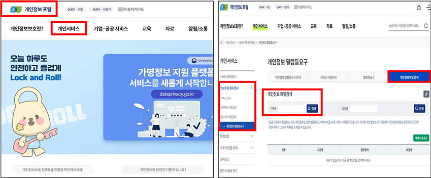 - 경로 : 개인정보 포털 → 개인서비스 → 정보주체 권리행사 → 개인정보 열람등요구 → 개인정보파일 검색